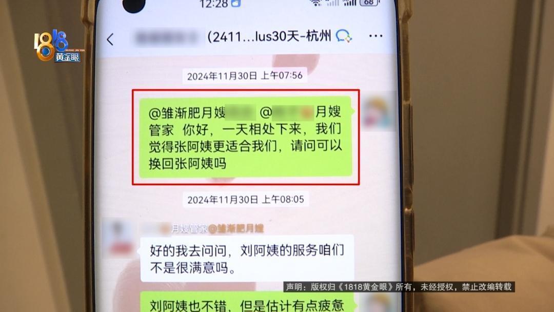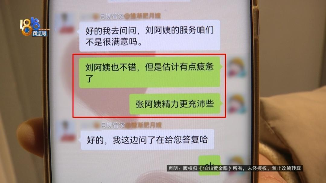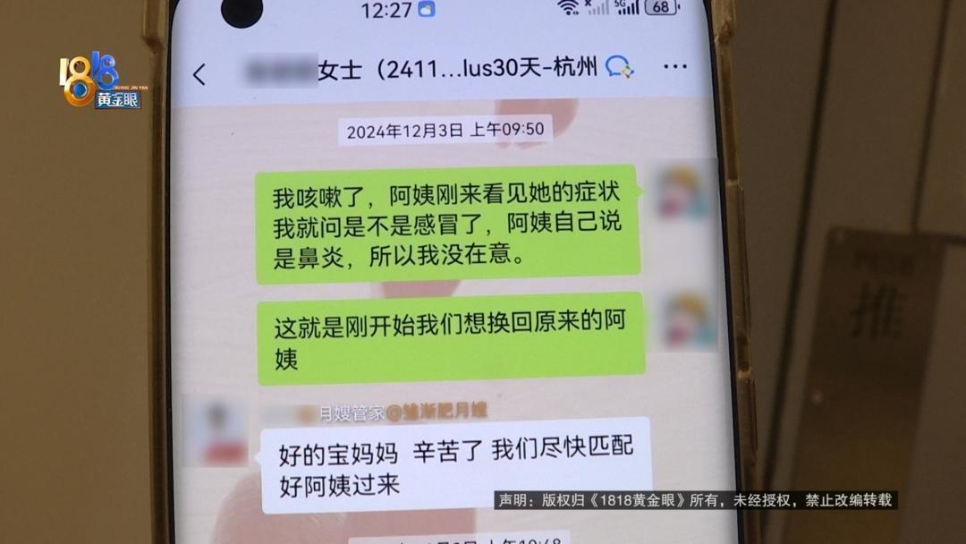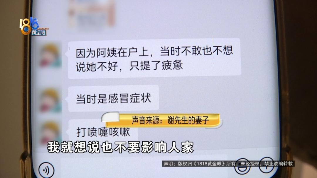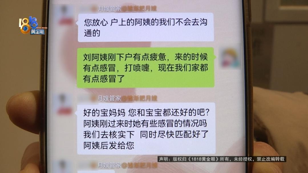 谢先生告诉记者,刘阿姨上户没几天,妻子开始有了咳嗽的症状,去年12月3号,他们跟机构说明情况提出要更换月嫂。