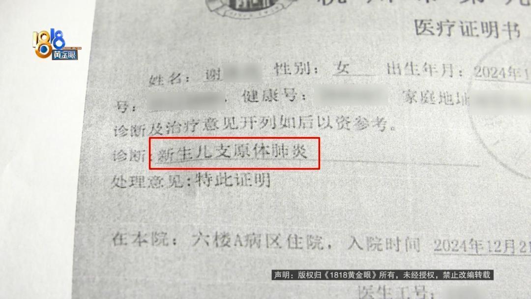 谢先生说后来机构安排了新的月嫂,但女儿已经出现了症状,医院的诊断上谢先生的妻子是呼吸道感染 ,女儿是新生儿支原体肺炎。