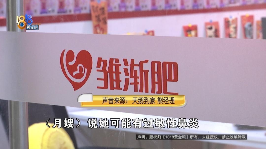 谢先生介绍,去年11月底女儿出生了,他们联系了雏渐肥机构找月嫂来照顾妻子跟孩子,为期一个月总共交了18597元。第一天是别的月嫂来顶班,第二天刘阿姨上户了,有一些类似感冒的症状。
